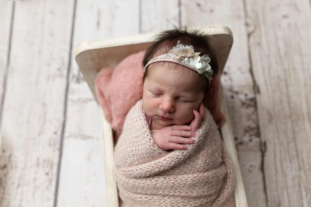 Newborn baby sleeping in a small, white wooden bed, wrapped in a cream blanket, wearing a headband with a flower.