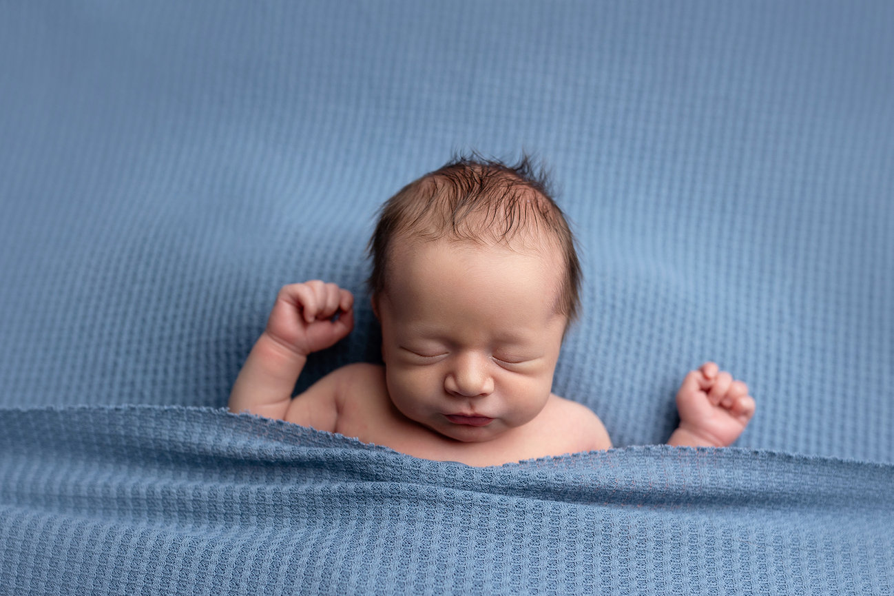Omaha, Nebraska Newborn Photographer, Sleeping baby wrapped in a blue blanket, lying on a fluffy, gray surface against a dark background.