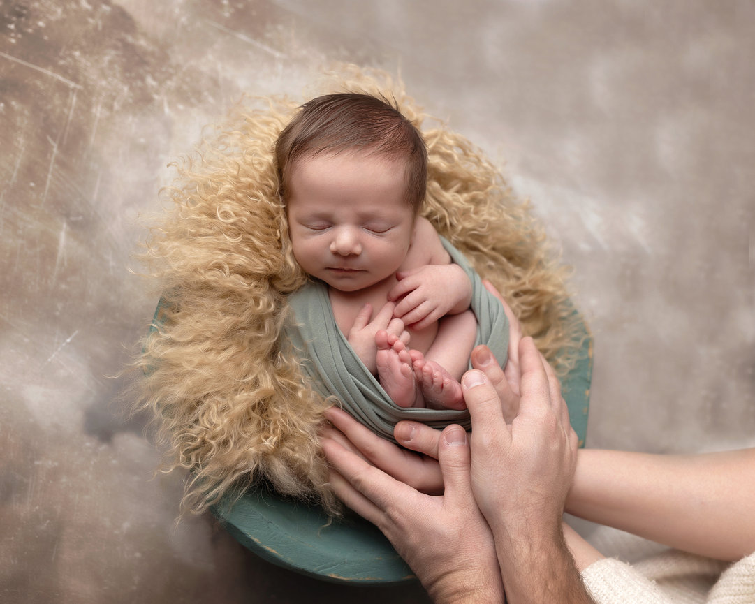 Omaha, Nebraska Newborn Photographer photographs a sleeping baby on a soft surface, wearing a light green hat.